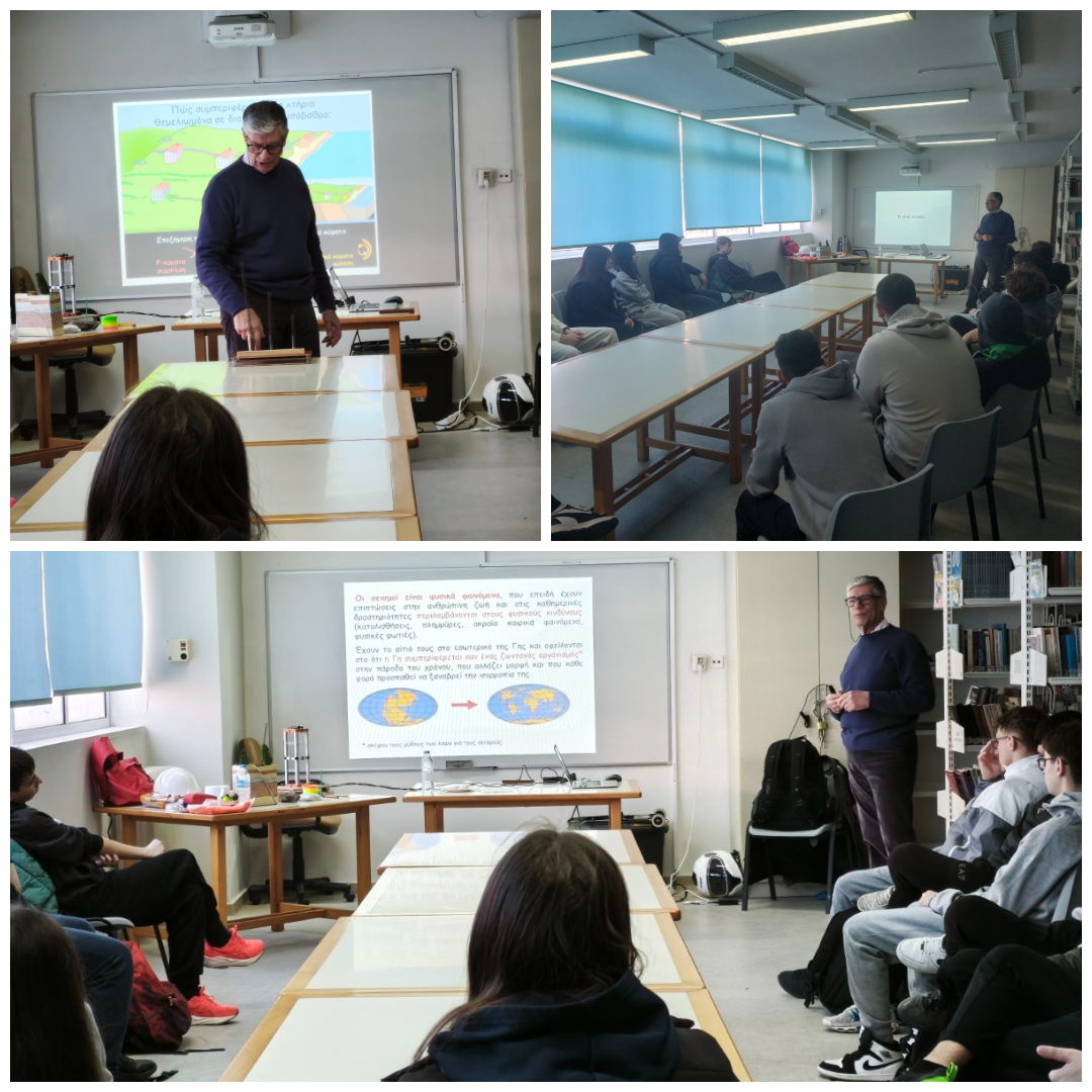 Την Πέμπτη 26 Φεβρουαρίου 2026 ο Δρ. Ιωάννης Καλογεράς, ομότιμος ερευνητής του Εθνικού Αστεροσκοπείου Αθηνών, ενημέρωσε τους μαθητές/τριες της A' Λυκείου του σχολείου μας για το φαινόμενο του σεισμού. Η παρουσίαση με τίτλο "Περί σεισμών: Τι, πώς και γιατί" είχε σκοπό την κατανόηση του φαινομένου, την αναγκαιότητα τήρησης των μέτρων προστασίας για αποτελεσματική άμυνα έναντι του σεισμού και μερικά παραδείγματα εφαρμογής της Εκπαιδευτικής Σεισμολογίας. Με το πέρας της παρουσίασης προτάθηκε να ακολουθήσει σύντομα και σχετική ενημέρωση των εκπαιδευτικών, με στόχο ενδιαφέροντα και δεξιότητες των μαθητών/τριών και των εκπαιδευτικών να βρουν εφαρμογή στο συγκεκριμένο αντικείμενο.